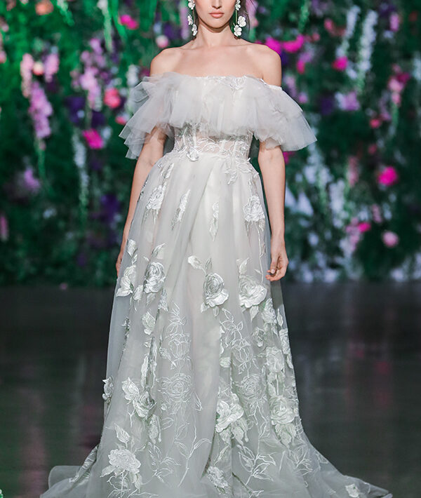 Oh my goodness — the detailing on this gown. Not only is the stone work impeccable, but the tulle godets brimming from the skirt are an absolute eye-catcher. The straps run into a t-back style in a beautiful modern touch.
